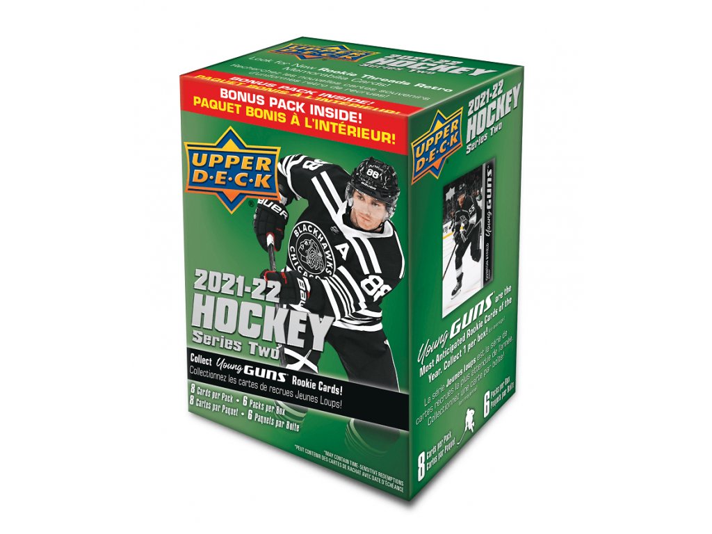 Každý 2021-22 UD Series 2 Hockey Blaster Box obsahuje 6 balíčků v boxu a 8 karet v balíčku. Série 2 obsahuje další 250 karet navazujících na sérii 1. Skládá je z 200 karet současných hráčů a 50 karet s nováčky YOUNG GUNS.